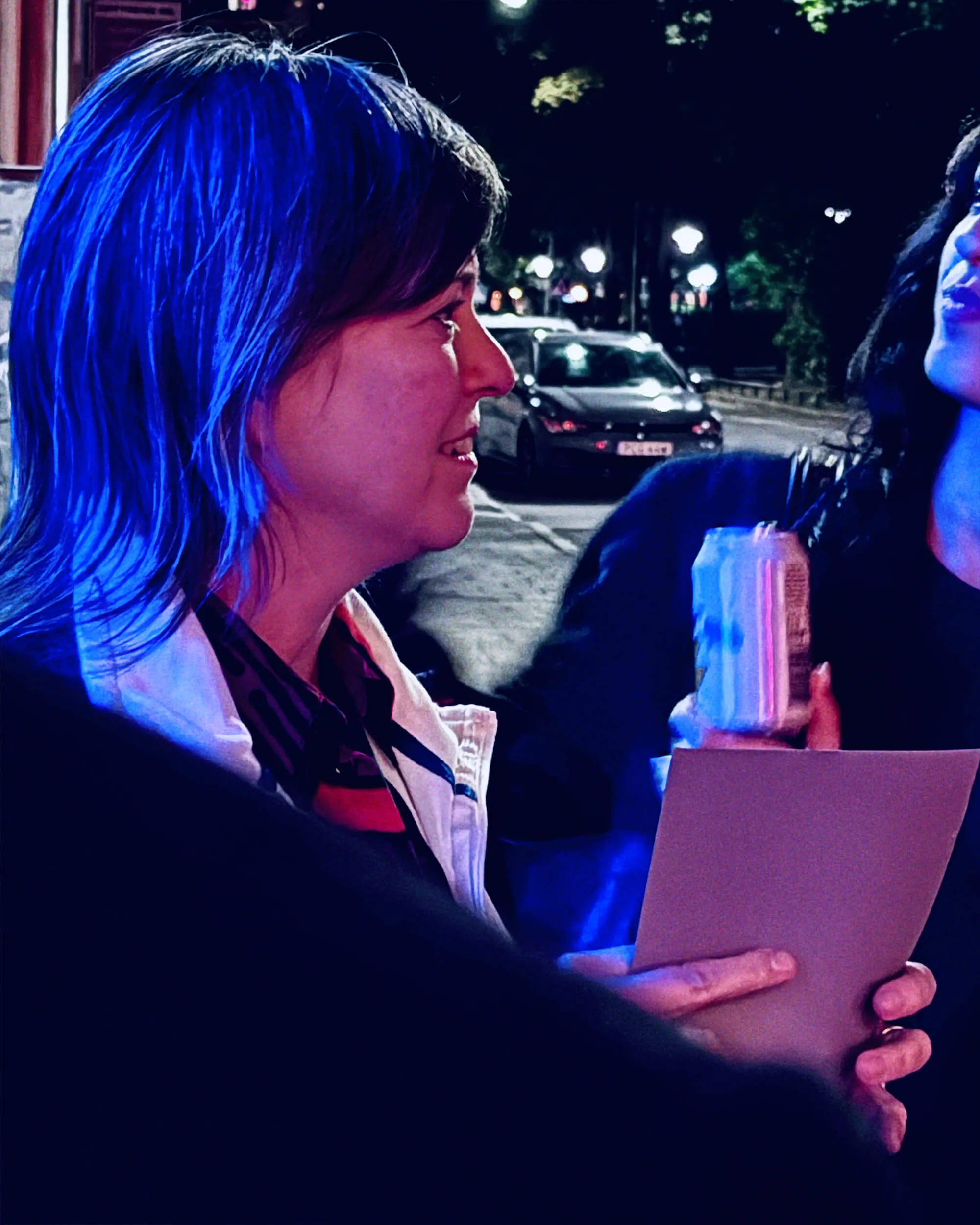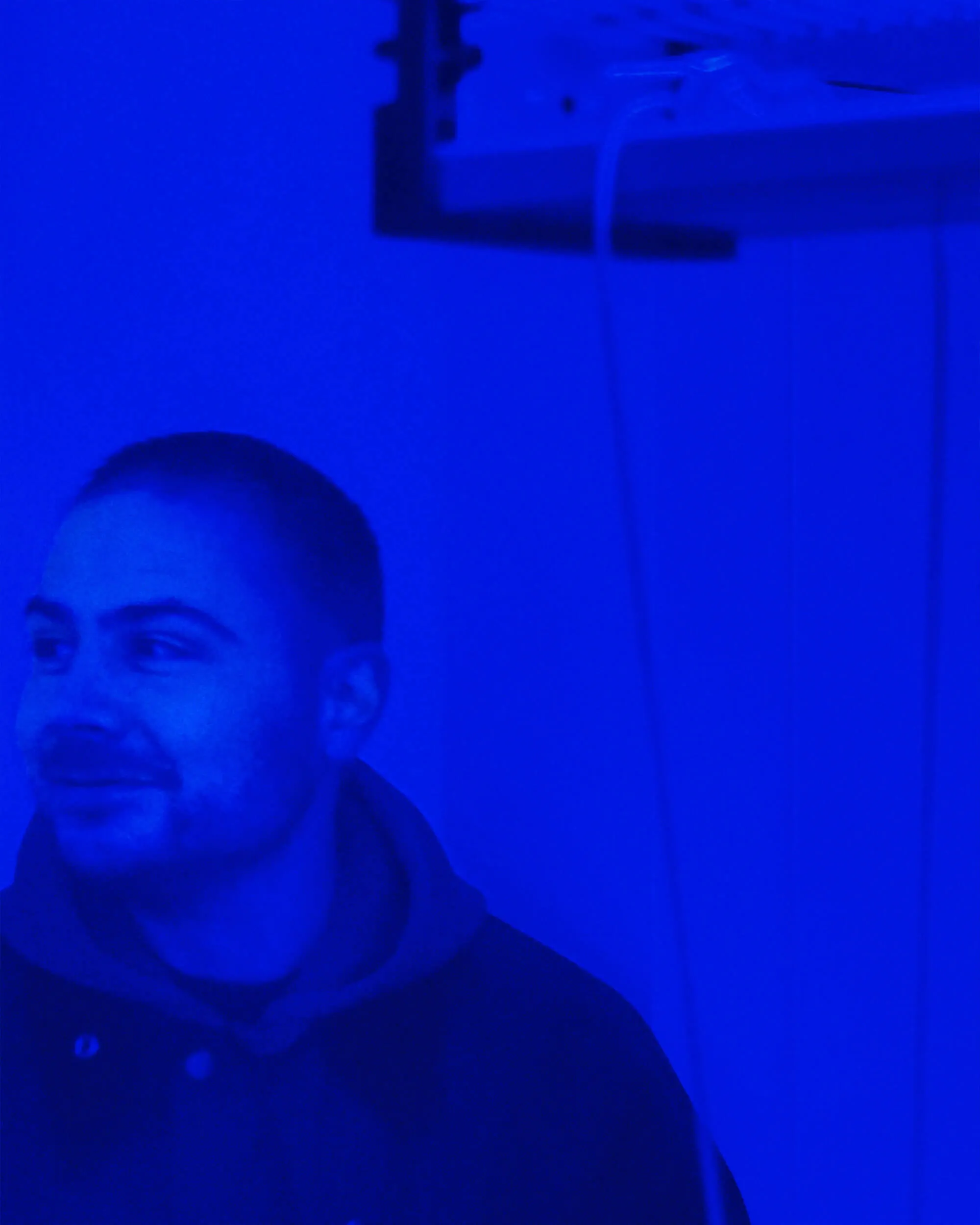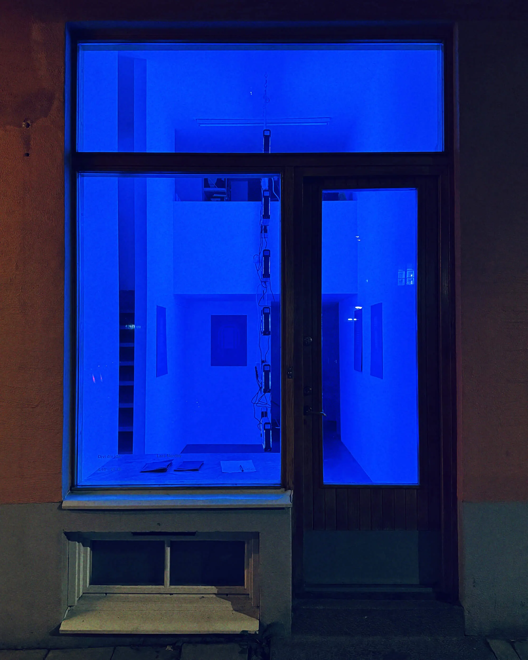 The exhibition ”Divi div ide” further explores two previous exhibitions combined: ”Restaging Parallax” (ICA—Institute of Contemporary Art in Sofia, 2022) and ”Blue Seats” (Centralbanken in Oslo, 2024). In the exhibition, five silkscreen prints, reminiscent of blueprints of theatre halls, are mounted on the walls. The prints are done with luminescent paint, which is activated by an insect-killing UV light. The metaphor of the insect-killing UV light serves as a reflection on the seductive and potentially destructive forces that shape us as individuals and as societies, particularly in relation to how we engage with narratives, ideologies, and the allure of certain truths. The theatre, like the gallery space, reminds us of the situation in which the spectators often finds themselves — how we passively consume information, narratives, and rhetoric that shape our reality, often without realizing the consequences.