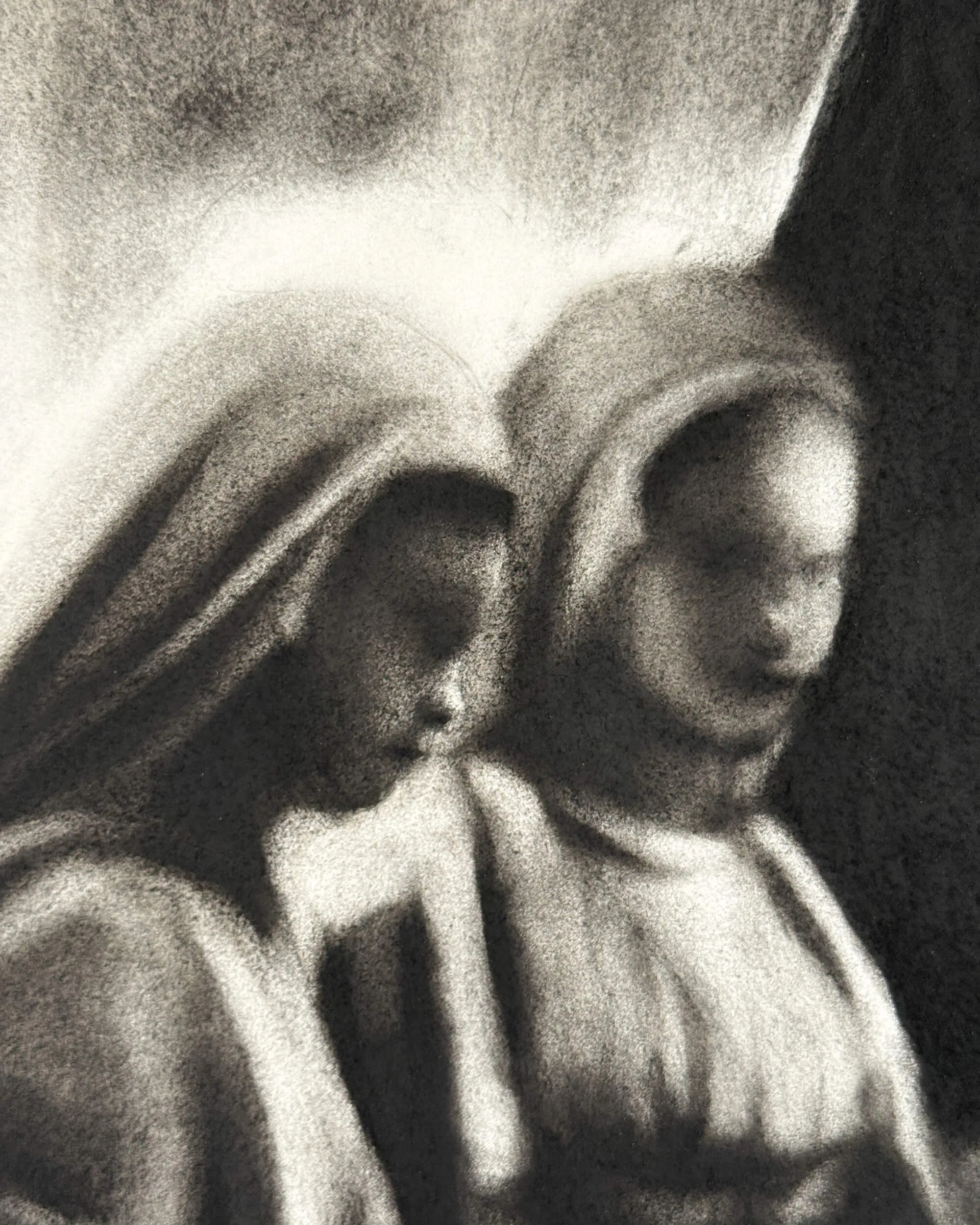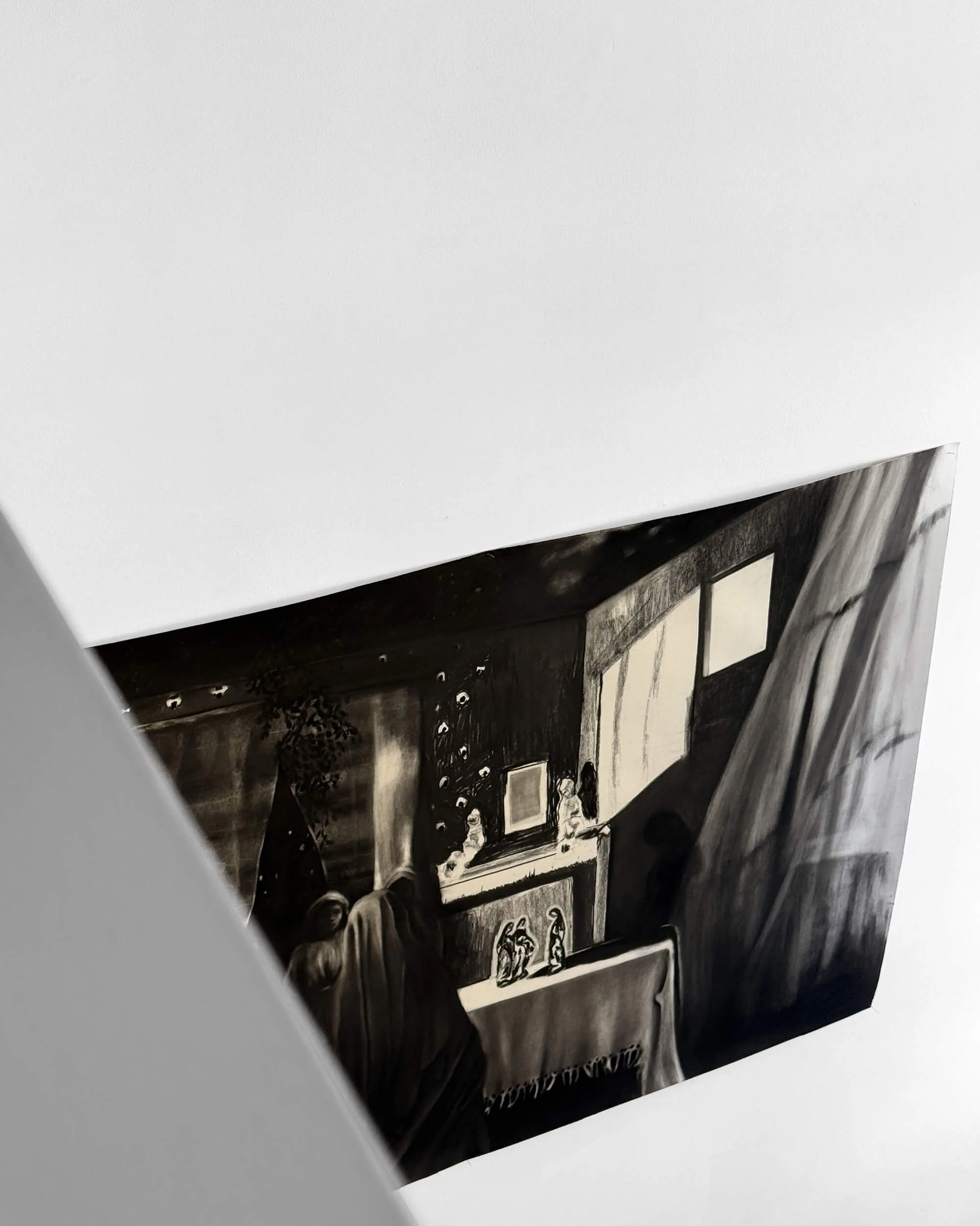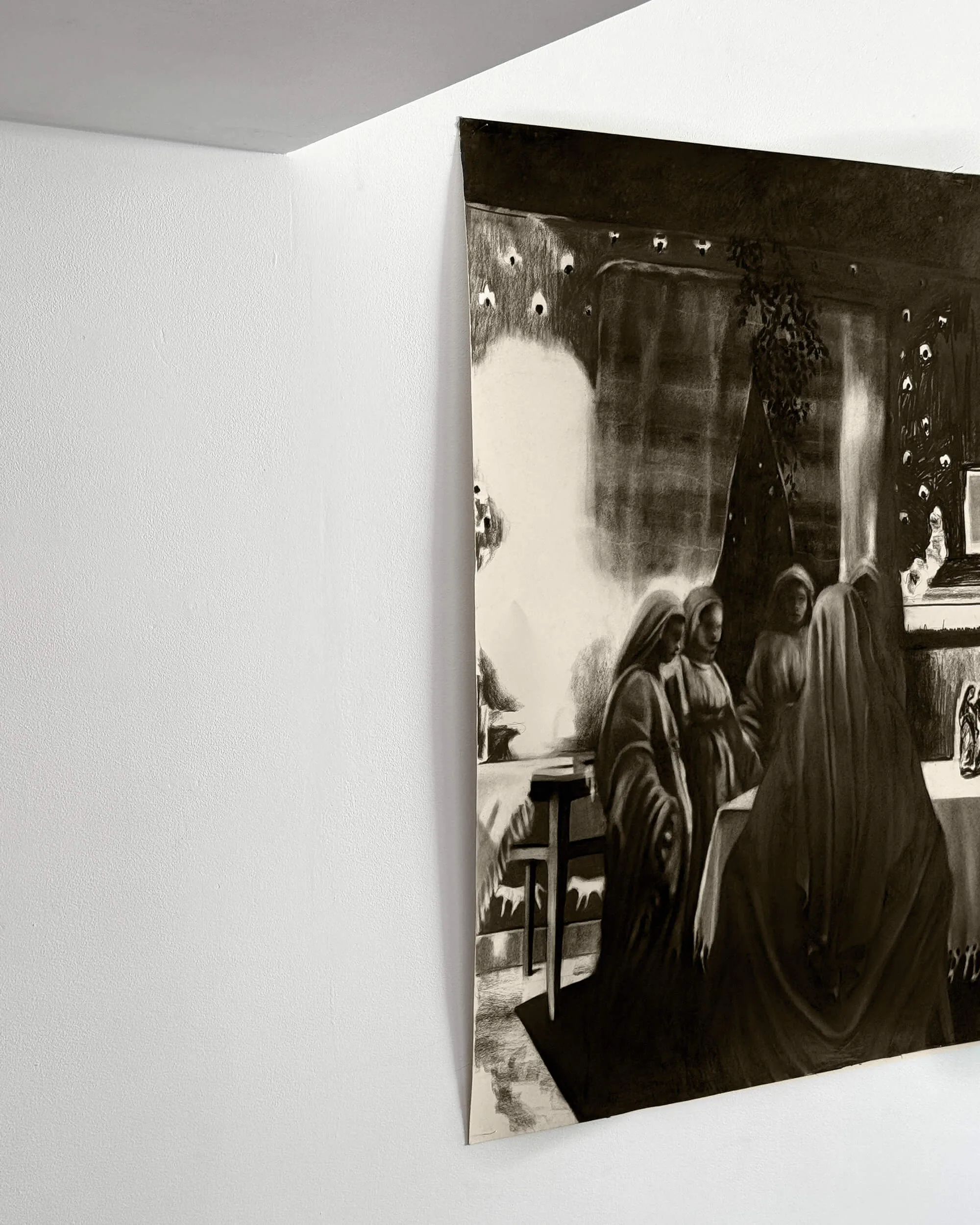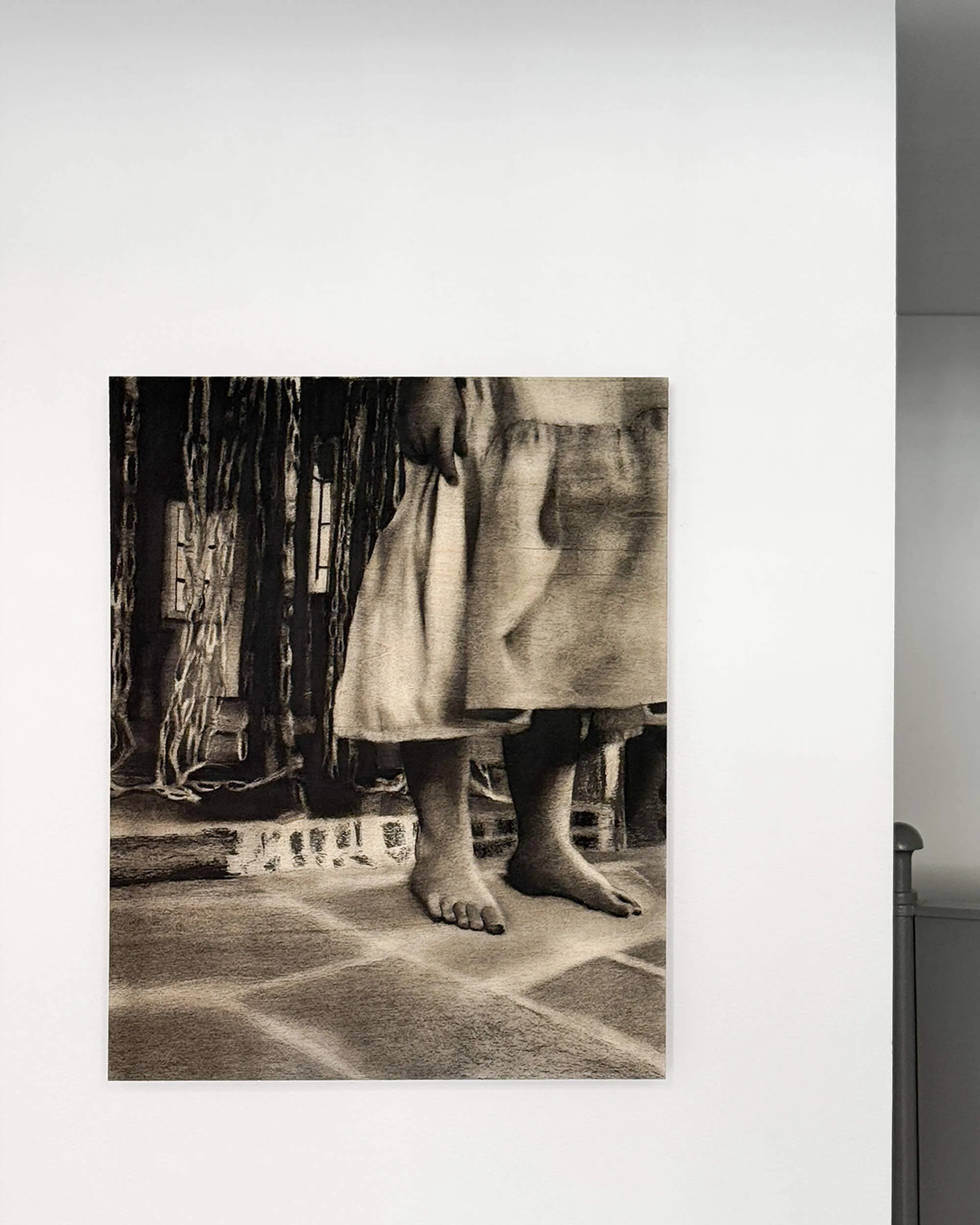 The blades of grass flicker through the exhibition, which portrays a rite of passage through the medieval ring dance La Carole — not as a visible motif, but as a quiet rhythm that lingers beneath the three works, shaping their stages through memory and rhythm.
